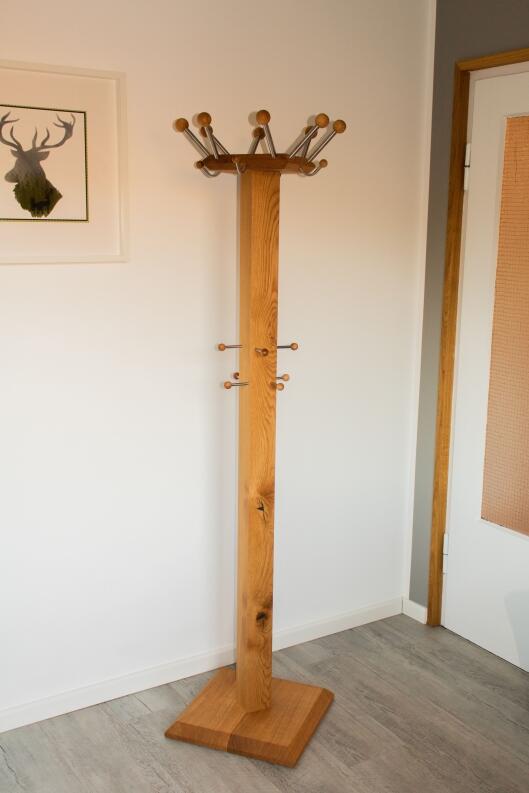 Garderobenständer aus Holz "Satellit" - Eiche geölt mit Edelstahl-Haken